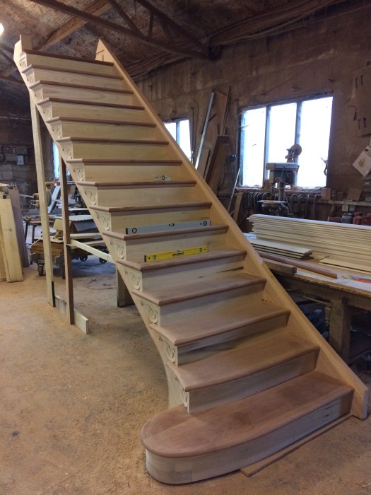 Posted on April 25, 2019 by fitzgeraldjoineryStairs Stairs in production with curved bottom three steps and hand carved carvers on string. Share this:TweetMore Email a link to a friend (Opens in new window) Email Like Loading... Related